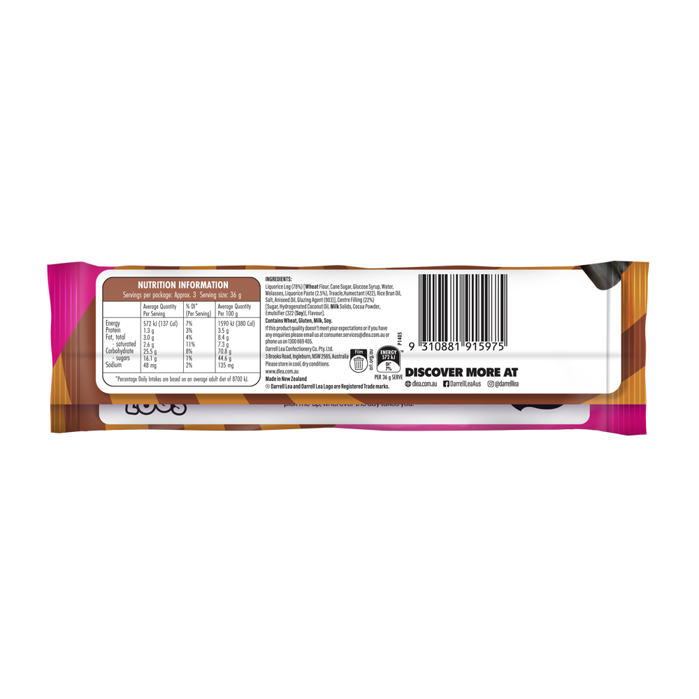Liquorice Log (78%) [Wheat Flour, Cane Sugar, Glucose Syrup, Water, Molasses, Liquorice Paste (2.5%), Treacle, Humectant (422), Rice Bran Oil, Salt, Aniseed Oil, Glazing Agent (903)], Centre Filling (22%) [Sugar, Hydrogenated Coconut Oil, Milk Solids, Cocoa Powder, Emulsifier (322 (Soy)), Flavour].
